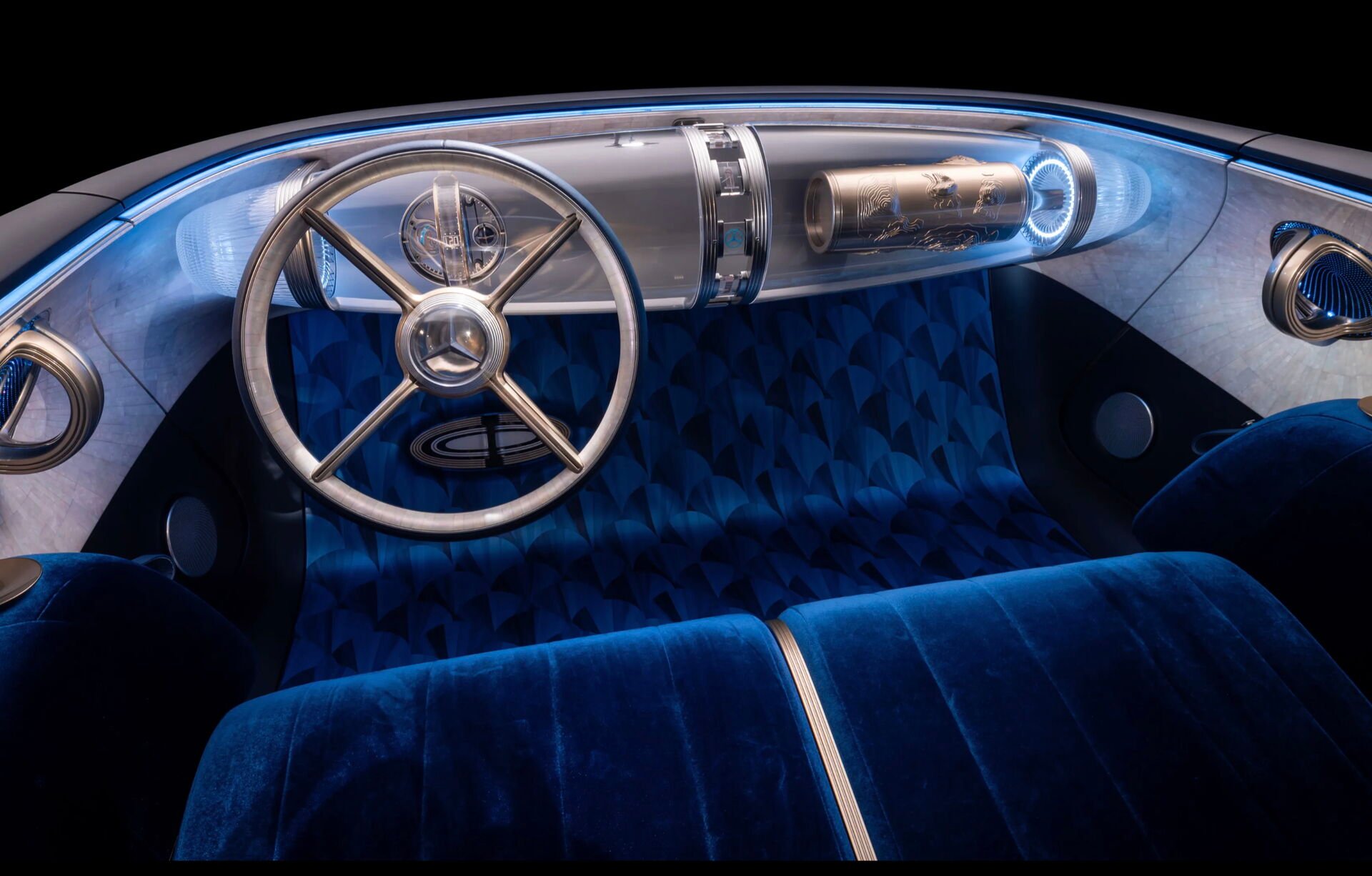 Der Innenraum? Art Deco trifft Futurismus: Blaue Samtsitze, Messinggriffe, ein schwebendes Glasarmaturenbrett und ein “Zeppelin”-Display, um das Schiff zu manövrieren. Die Uhr im Zentrum fungiert als KI-Begleiter, was gleichzeitig faszinierend und ein bisschen beängstigend ist.