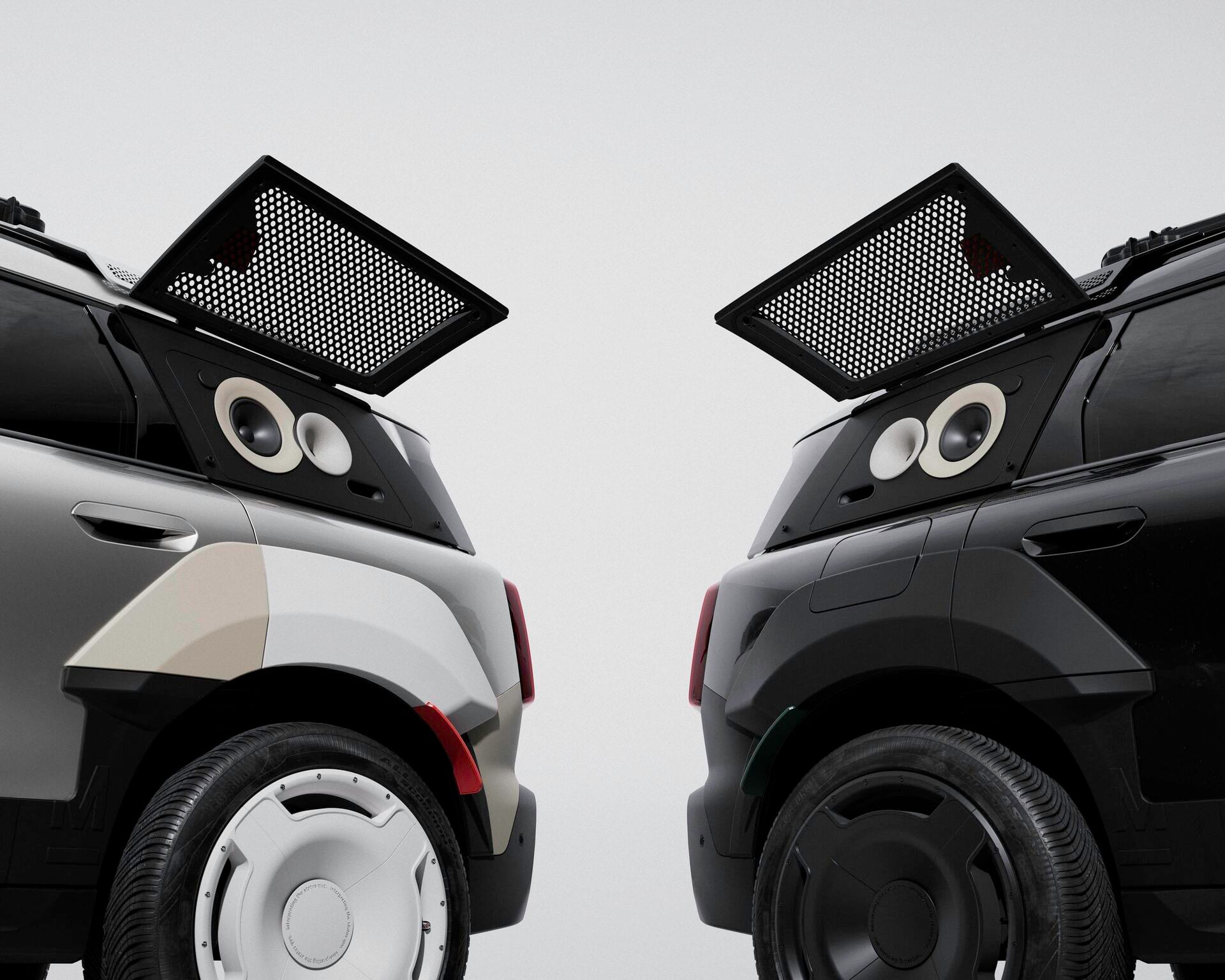 Vom SUV zur Soundmaschine: Genau das haben MINI und das Grazer Designstudio Vagabund Moto gebaut. Die beiden Einzelstücke basieren auf dem MINI Countryman – doch das ist eigentlich nur die technische Basis. Dazu kommen Details, die zeigen, dass hier nicht einfach “getunt” wurde, sondern designt. Der Countryman wurde höher gelegt, breiter gemacht und mit Offroad-Optik versehen. Nice. Dazu: 20-Zoll-Räder mit Lautsprecher-Optik. Wohoo! Und auf dem Dachträger ein mobiles Bühnen-Setup – hell yeah!